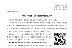 宮川⼩学校保護者の皆さま平素より育友会活動にご協⼒いただきありがとうございます。 2025年11⽉15⽇(⼟)に宮川⼩学校にて⾳楽発表会が開催されます。つきましては、 育友会として開催のお⼿伝いをするボランティアを募集い […]
